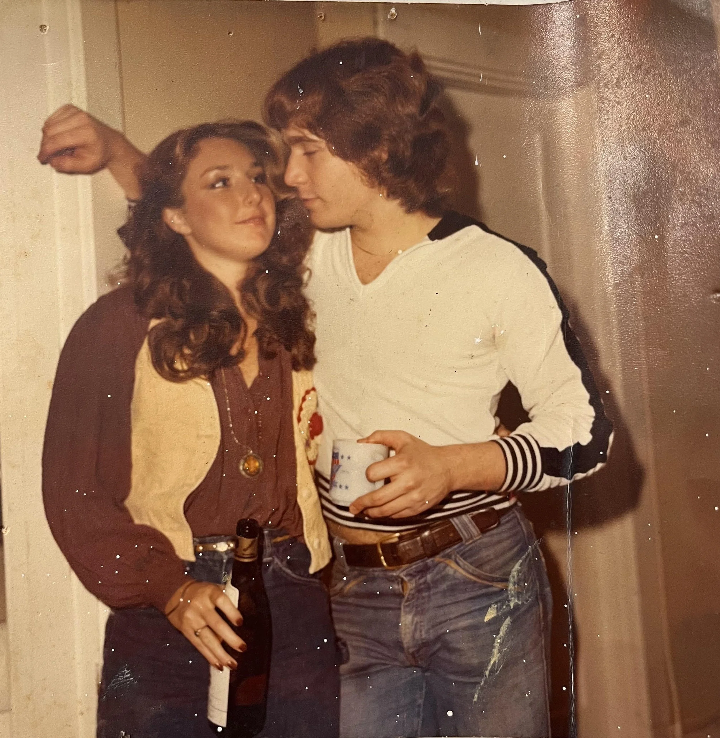 Das Bild zeigt ein junges Paar, Ende der siebziger oder Anfang der achtziger Jahre. Vermutlich auf einer Party, in einem schmalen Flur eines Einfamilienhauses irgendwo in den USA. Es ist das perfekte Social-Media-Relikt für den Satz: früher war alles besser – die Partys, die Beziehungen, die Leichtigkeit des Seins. Körnung, Farbverschiebung, Kratzer, leicht vergilbter Rand – all die Spuren analoger Vergangenheit sind vorhanden. Zu vorhanden.